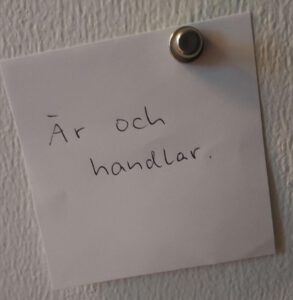 In den skandinavischen Sprachen gibt es manche Ausdrücke, die auf den ersten Blick widersinnig sind. Schwedische Beispiele wären det står i boken som du sitter och läser (das steht in dem Buch, das du gerade sitzt und liest), sluta och gnäll (hör auf und jammer) oder jag är och jobbar (ich bin und arbeite). Was diese Beispiele gemeinsamm haben, ist die Verbindung von zwei Verben mit und, bei der eine wörtliche Lesart nichts Sinnvolles ergibt. Wie kann man ein Buch sitzen? Was soll man nun tun, jammern oder damit aufhören? Und wie kann man lernen, ohne zu sein?
